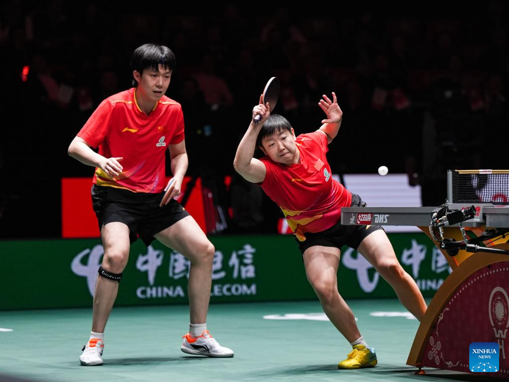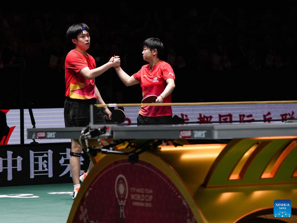 Wang Chuqin/Sun Yingsha (R) of China compete in the mixed doubles match against Matsushima Sora/Odo Satsuki of Japan during the final match between China and Japan at the ITTF Mixed Team World Cup 2025 in Chengdu, southwest China's Sichuan Province, Dec. 7, 2025. (Xinhua/Wang Xi)