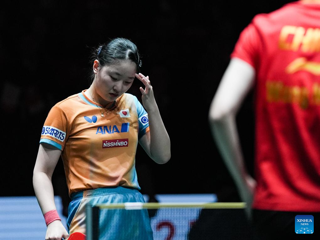 Wang Manyu (L) of China reacts in the women's singles match against Harimoto Miwa of Japan during the final match between China and Japan at the ITTF Mixed Team World Cup 2025 in Chengdu, southwest China's Sichuan Province, Dec. 7, 2025. (Xinhua/Wang Xi)
