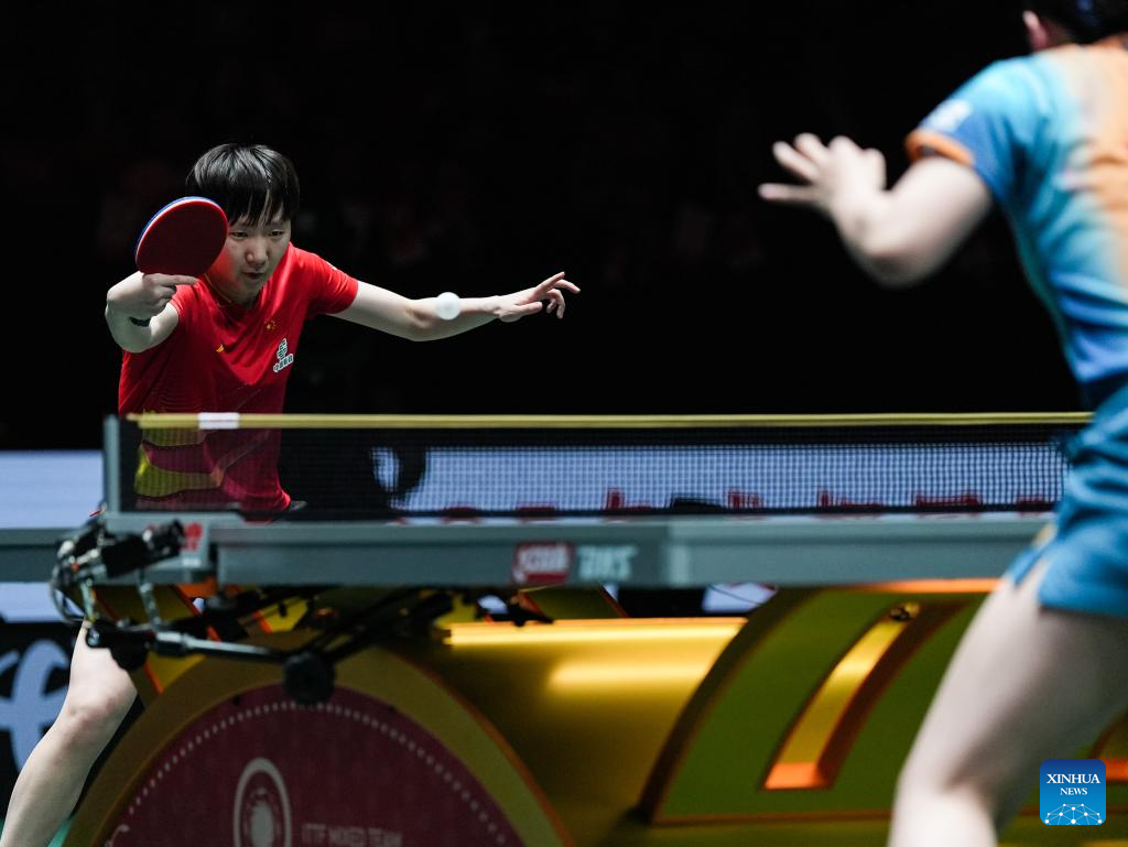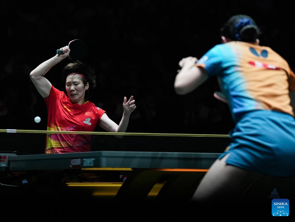 Wang Manyu (L) of China competes in the women's singles match against Harimoto Miwa of Japan during the final match between China and Japan at the ITTF Mixed Team World Cup 2025 in Chengdu, southwest China's Sichuan Province, Dec. 7, 2025. (Xinhua/Wang Xi)