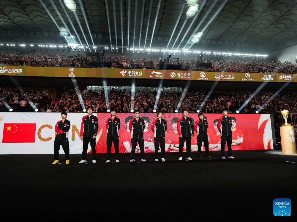 Team members of China are seen before the final match between China and Japan at the ITTF Mixed Team World Cup 2025 in Chengdu, southwest China's Sichuan Province, Dec. 7, 2025. (Xinhua/Wang Xi)