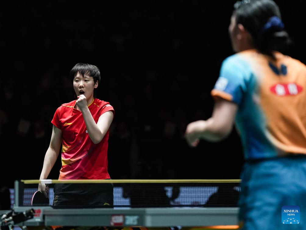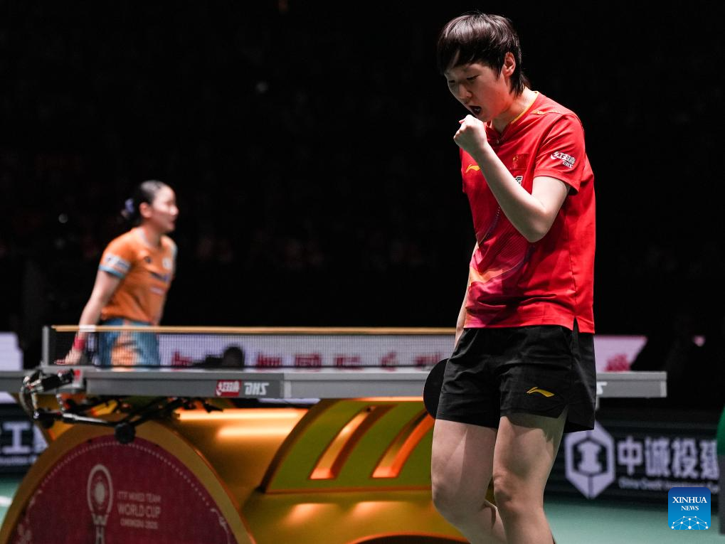 Wang Manyu (R) of China reacts in the women's singles match against Harimoto Miwa of Japan during the final match between China and Japan at the ITTF Mixed Team World Cup 2025 in Chengdu, southwest China's Sichuan Province, Dec. 7, 2025. (Xinhua/Wang Xi)