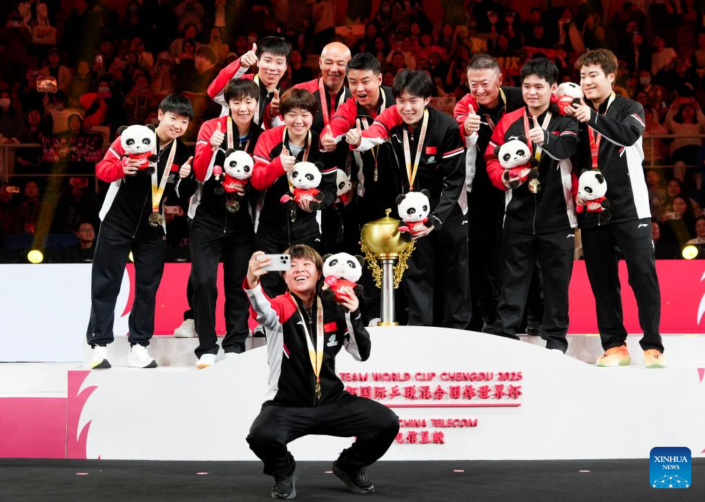 Gold medalists team China pose for a selfie during the awarding ceremony at the ITTF Mixed Team World Cup 2025 in Chengdu, southwest China's Sichuan Province, Dec. 7, 2025. (Xinhua/Wang Ying)