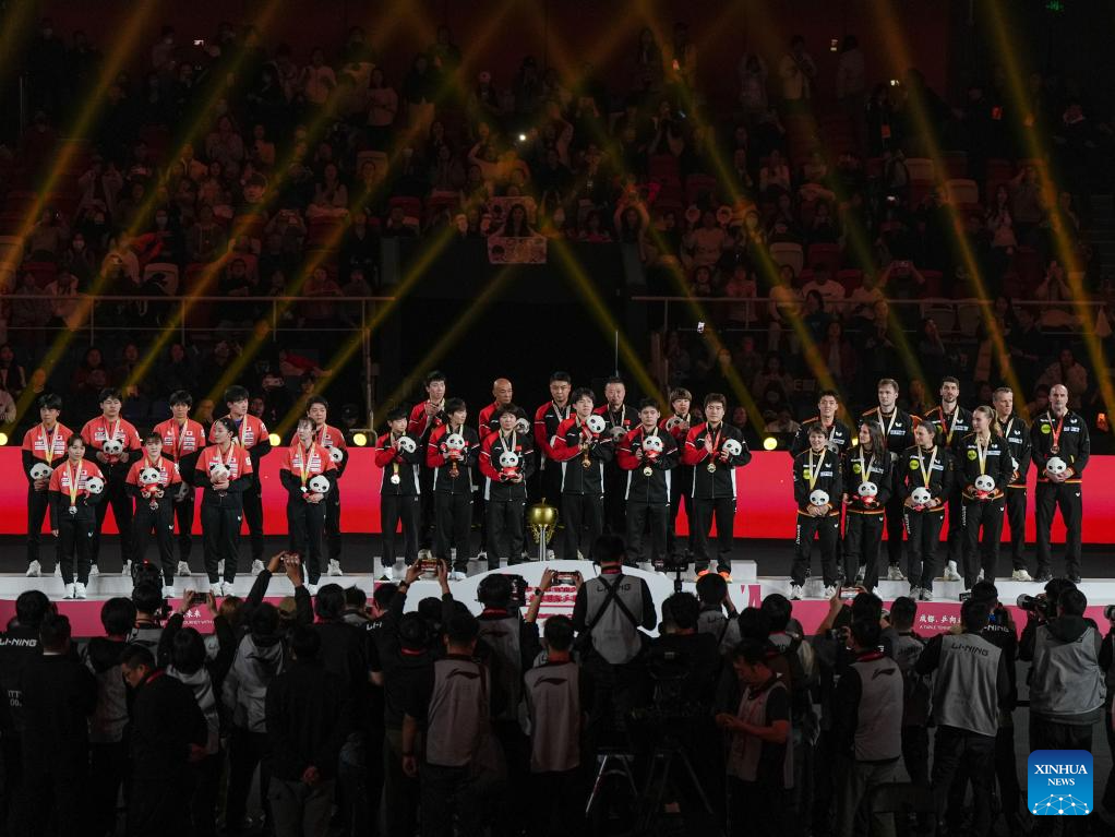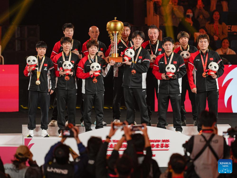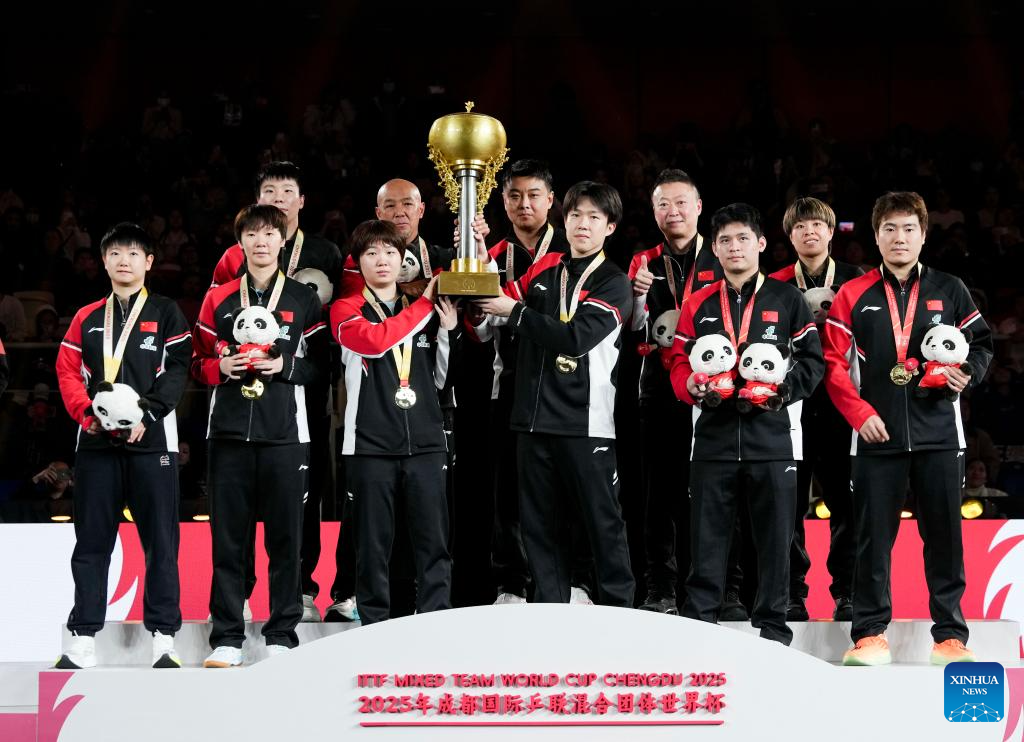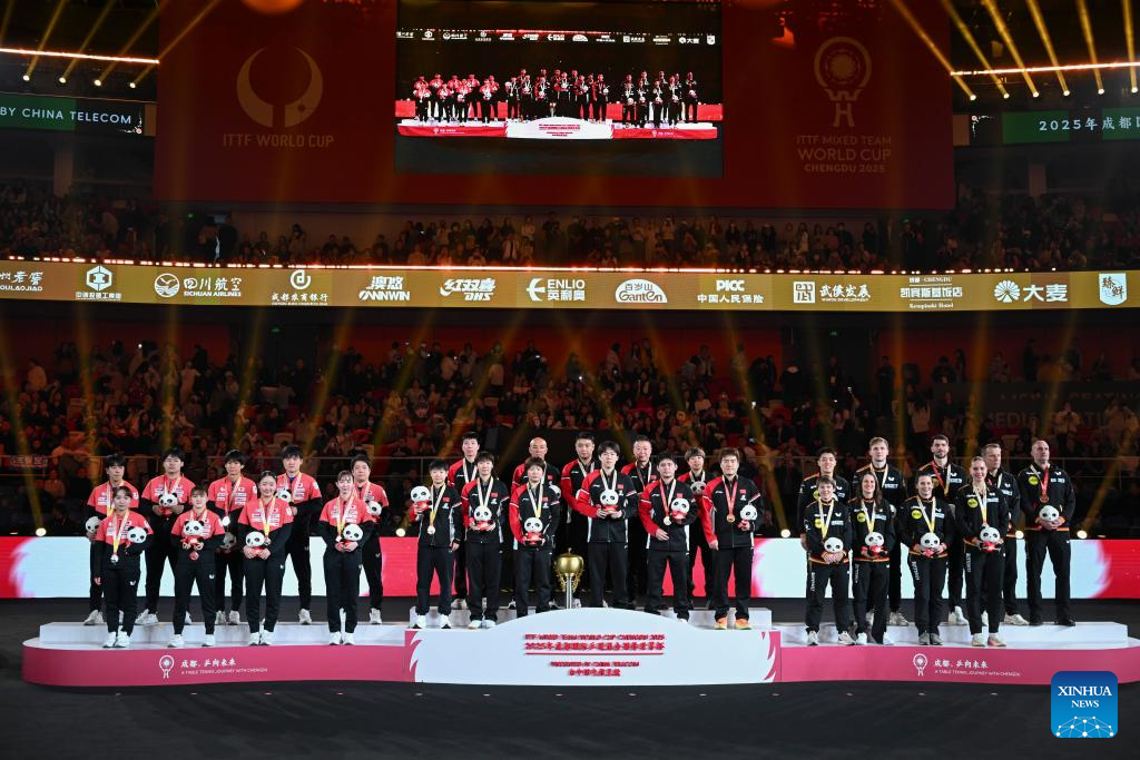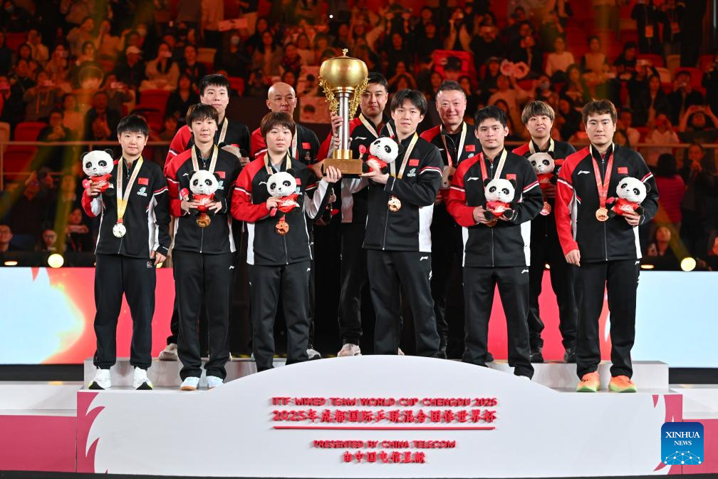 Gold medalists team China pose during the awarding ceremony at the ITTF Mixed Team World Cup 2025 in Chengdu, southwest China's Sichuan Province, Dec. 7, 2025. (Xinhua/Wang Ying)