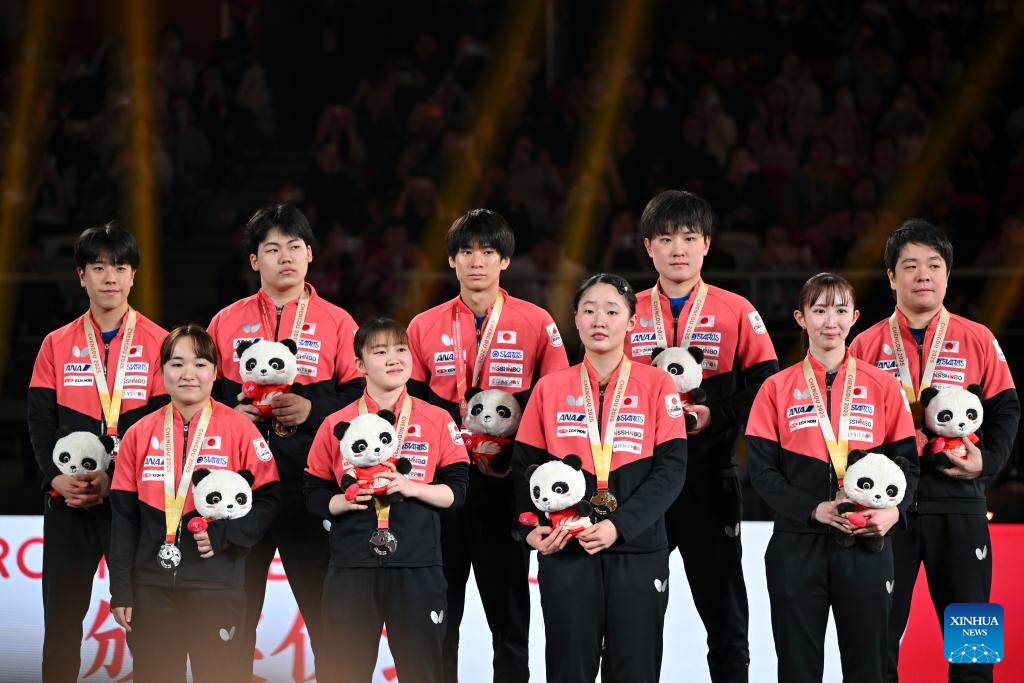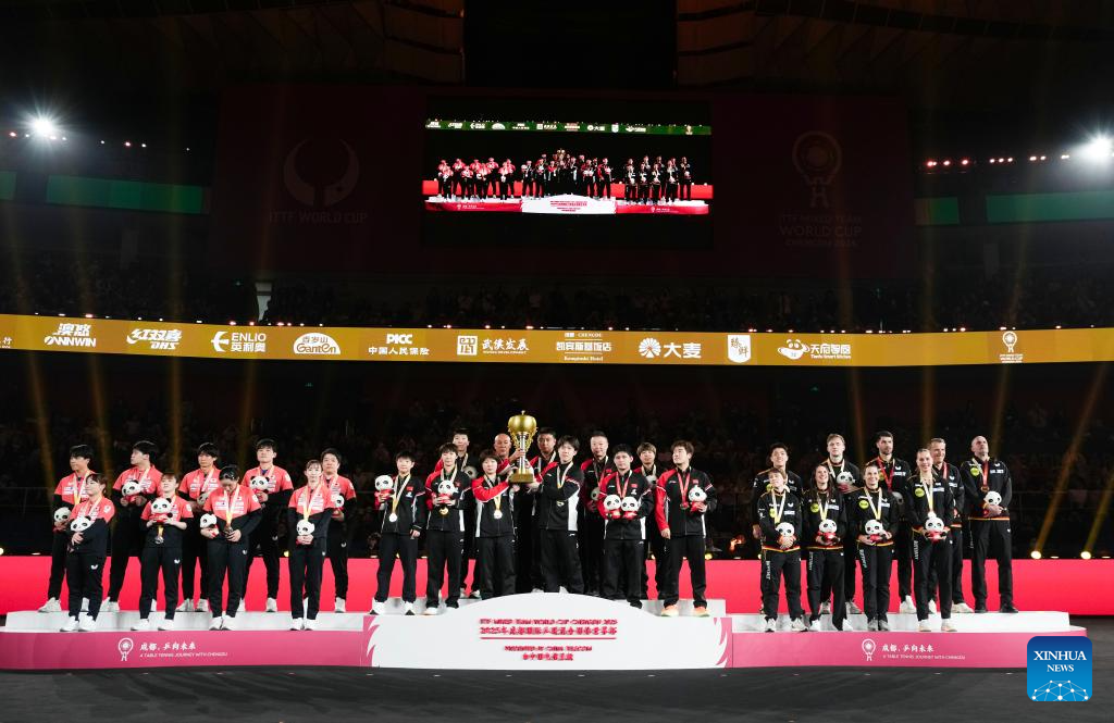 Gold medalists team China (C), silver medalists team Japan (L) and bronze medalists team Germany are seen during the awarding ceremony at the ITTF Mixed Team World Cup 2025 in Chengdu, southwest China's Sichuan Province, Dec. 7, 2025. (Xinhua/Wang Xi)