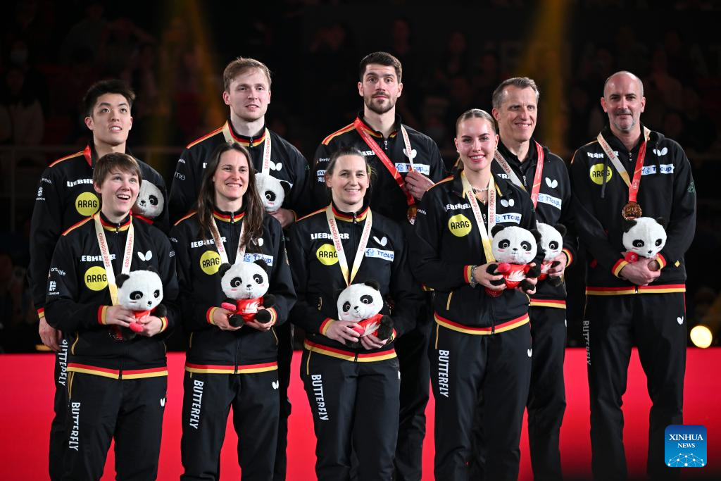 Bronze medalists team Germany pose during the awarding ceremony at the ITTF Mixed Team World Cup 2025 in Chengdu, southwest China's Sichuan Province, Dec. 7, 2025. (Xinhua/Xu Bingjie)