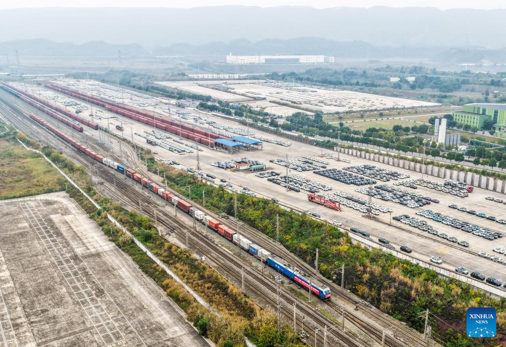 An aerial drone photo shows a cargo train of the Chongqing-Central Asia International Railway Express under China-Singapore Multi-modal Demonstration Project before departure at the Yuzui Station in southwest China's Chongqing, Dec. 15, 2025.