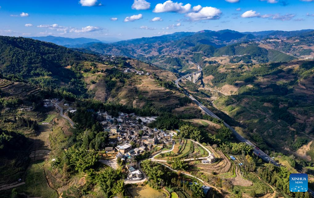 An aerial drone photo taken on Dec. 20, 2025 shows the Manhai Village in Mojiang Hani Autonomous County of Pu'er City, southwest China's Yunnan Province.(Xinhua/Chen Xinbo)