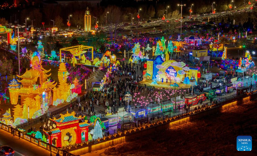 An aerial drone photo taken on Dec. 20, 2025 shows a light festival in Horqin Right Wing Front Banner, Hinggan League, north China's Inner Mongolia Autonomous Region. A light festival kicked off here on Saturday, attracting many people to come and enjoy various illuminated installations. (Xinhua)
