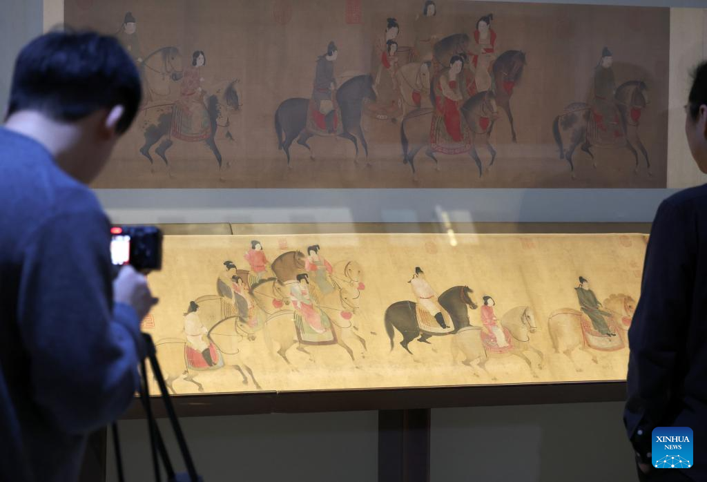 This photo taken on Dec. 29, 2025 shows a Song Dynasty (960-1279 AD) replica of the painting "Lady Guoguo's Spring Outing" at Liaoning Provincial Museum in Shenyang, northeast China's Liaoning Province. The painting, attributed to Tang Dynasty (618-907 AD) court painter Zhang Xuan, is one of the figure painting masterpieces depicting aristocratic women. The work will be on display at Liaoning Provincial Museum from Dec. 30, 2025 to March 29, 2026. (Xinhua/Li Gang)
