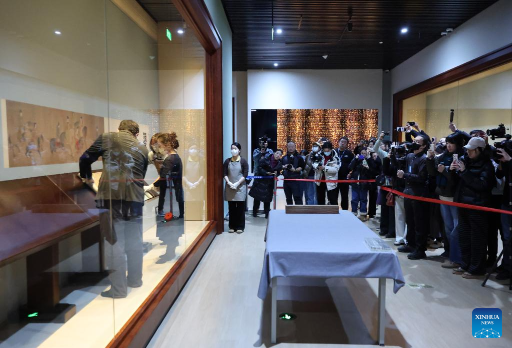 Staff members prepare a Song Dynasty (960-1279 AD) replica of the painting "Lady Guoguo's Spring Outing" for exhibition at Liaoning Provincial Museum in Shenyang, northeast China's Liaoning Province, Dec. 29, 2025. The painting, attributed to Tang Dynasty (618-907 AD) court painter Zhang Xuan, is one of the figure painting masterpieces depicting aristocratic women. The work will be on display at Liaoning Provincial Museum from Dec. 30, 2025 to March 29, 2026. (Xinhua/Li Gang)