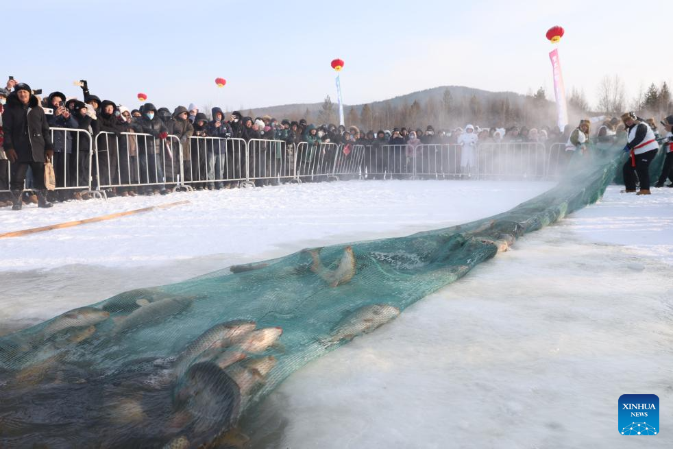 Tourists attend a winter fishing event in Mohe, northeast China's Heilongjiang Province, Dec. 30, 2025. The event held on Tuesday showcased some customs and folk arts only found in Mohe. (Photo by Shao Tianli/Xinhua)