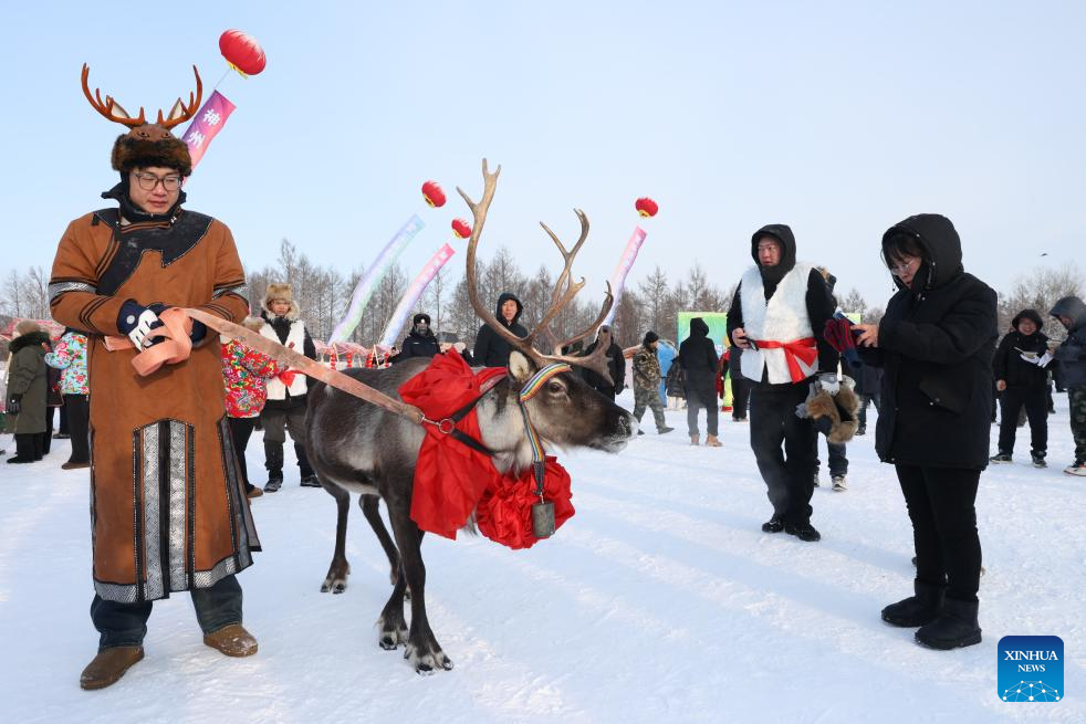 Tourists interact with a reindeer during a winter fishing event in Mohe, northeast China's Heilongjiang Province, Dec. 30, 2025. The event held on Tuesday showcased some customs and folk arts only found in Mohe. (Photo by Shao Tianli/Xinhua)