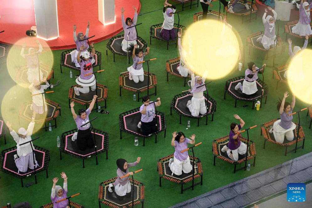 People participate in trampoline exercise at a mall in Tangerang, Banten province, Indonesia, Jan. 3, 2026. (Photo by Agung Kuncahya B./Xinhua)