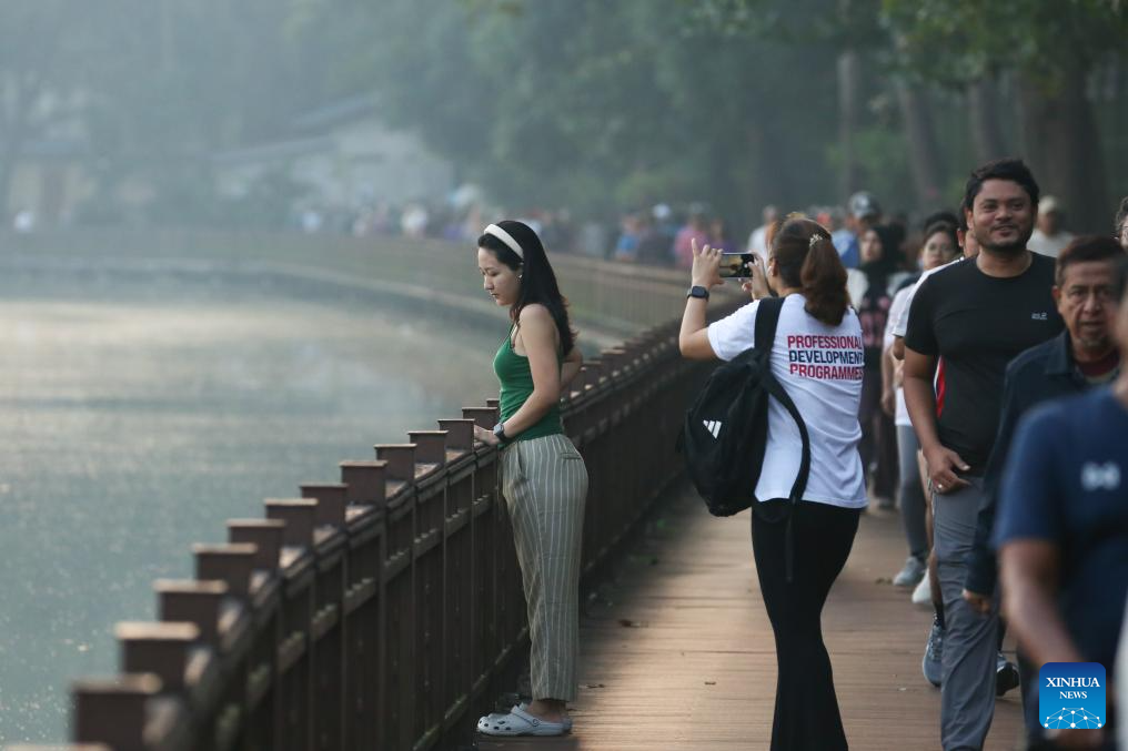 People walk by Kandawgyi lake in the early morning in Yangon, Myanmar, Jan. 3, 2026. (Xinhua/Myo Kyaw Soe)
