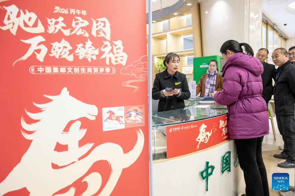 People buy special stamps marking the Year of the Horse and related products in Beijing, capital of China, Jan. 5, 2026. China Post on Monday unveiled a set of two special stamps to celebrate the upcoming Chinese zodiac Year of the Horse. (Xinhua/Li He)