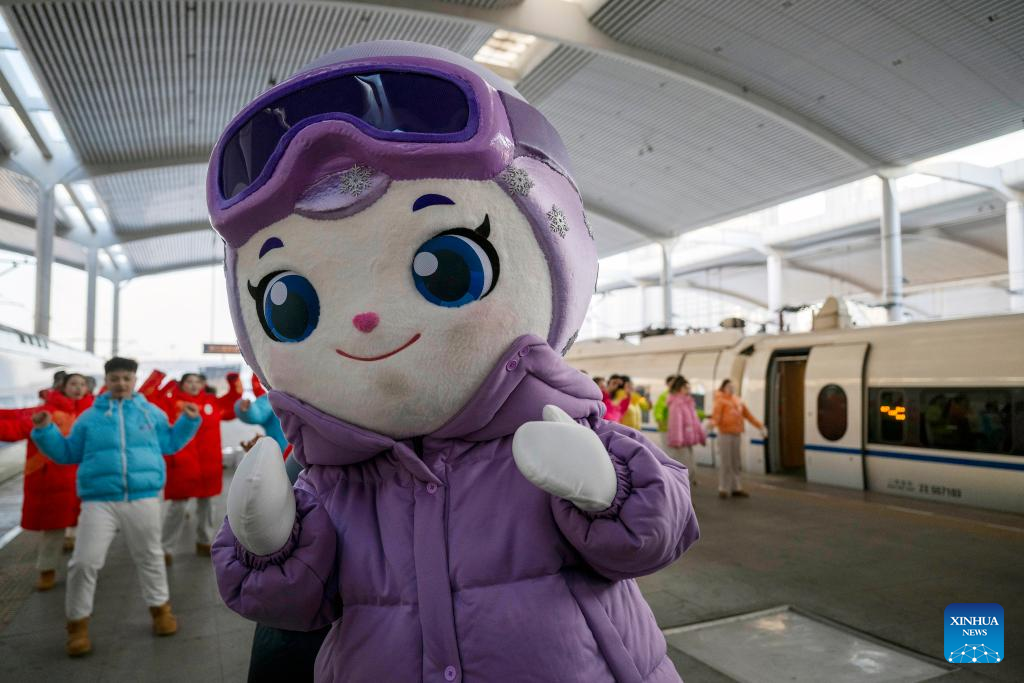 Performers dance outside the bullet train No.G1276, the first themed high-speed train of the Harbin Ice-Snow World, at Harbin West Station in Harbin, northeast China's Heilongjiang Province, Jan. 4, 2026. The first high-speed train with the theme of the Harbin Ice-Snow World began service from Harbin West Station on Sunday, heading for Wuhan City in central China's Hubei Province. Featuring unique interior and exterior decorations of the Harbin Ice-Snow World, the themed high-speed train serves as a mobile emblem to boost the ice and snow economy. (Xinhua/Zhang Tao)