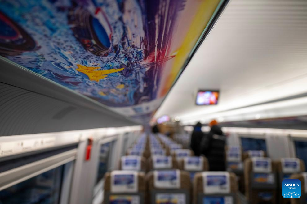This photo taken on Jan. 4, 2026 shows an interior view of the bullet train No.G1276, the first themed high-speed train of the Harbin Ice-Snow World. The first high-speed train with the theme of the Harbin Ice-Snow World began service from Harbin West Station on Sunday, heading for Wuhan City in central China's Hubei Province. Featuring unique interior and exterior decorations of the Harbin Ice-Snow World, the themed high-speed train serves as a mobile emblem to boost the ice and snow economy. (Xinhua/Zhang Tao)