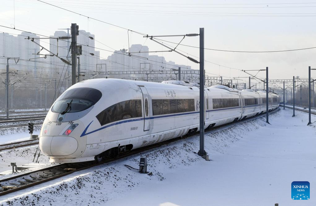 The bullet train No.G1276, the first themed high-speed train of the Harbin Ice-Snow World, departs from Harbin West Station in Harbin, northeast China's Heilongjiang Province, Jan. 4, 2026. The first high-speed train with the theme of the Harbin Ice-Snow World began service from Harbin West Station on Sunday, heading for Wuhan City in central China's Hubei Province. Featuring unique interior and exterior decorations of the Harbin Ice-Snow World, the themed high-speed train serves as a mobile emblem to boost the ice and snow economy. (Photo by Liu Yang/Xinhua)