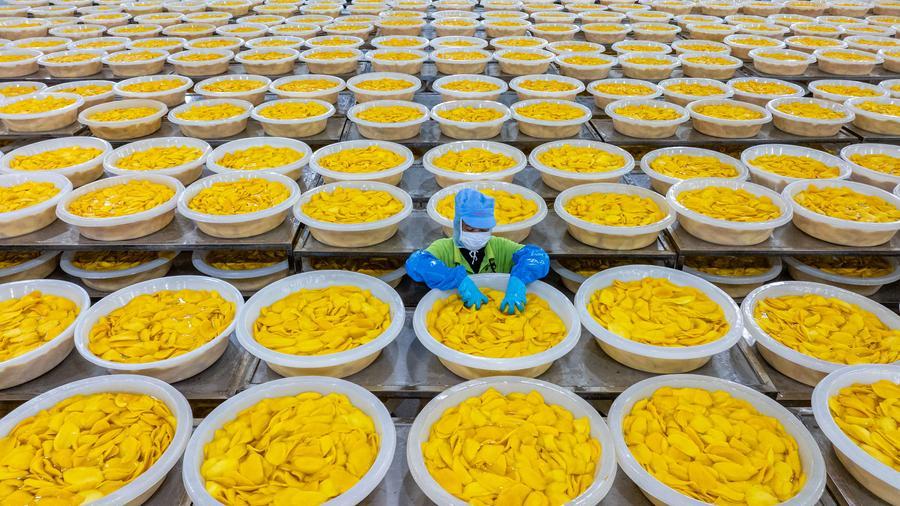 An aerial drone photo shows a worker examining the quality of mango slices at a mango processing factory in Phnom Sruoch district in Kampong Speu province, Cambodia, March 18, 2025. (Xinhua/Cheong Kam Ka)