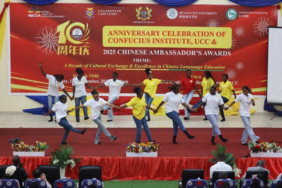 Students perform during a celebration marking the 10th anniversary of the Confucius Institute at the University of Cape Coast in Cape Coast, capital of Ghana's Central Region, Dec. 15, 2025. (Photo by Seth/Xinhua)