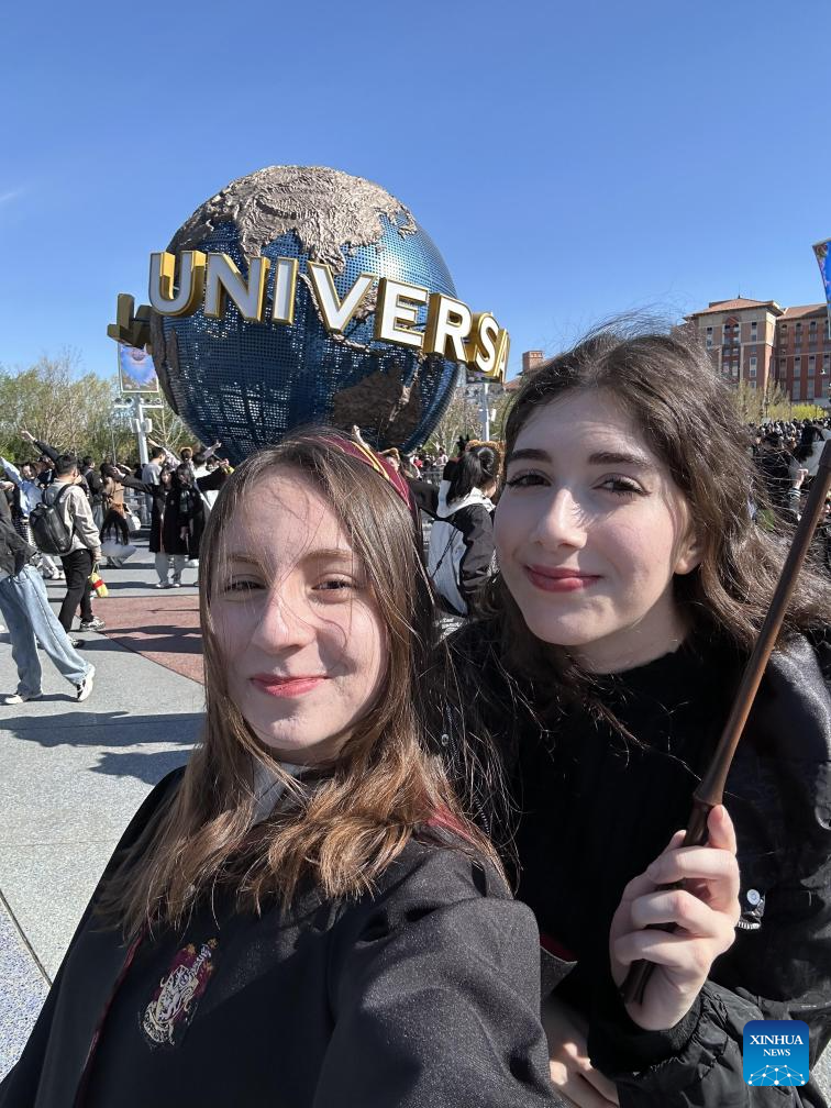 Türkan Hamza (R), a Turkish student majoring in Chinese-English translation, poses for photos with her friend at the Universal Beijing Resort in Beijing, capital of China, April 5, 2025. (Xinhua)