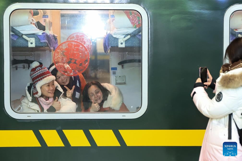 Foreign tourists pose for photos on K7041, a train themed on folk culture of northeast China, in northeast China's Heilongjiang Province, Jan. 19, 2026. Recently, tourists from Southeast Asian countries have been flocking to Harbin, hailed as China's "Ice City," with unprecedented enthusiasm. (Photo by Xu Shuai/Xinhua)