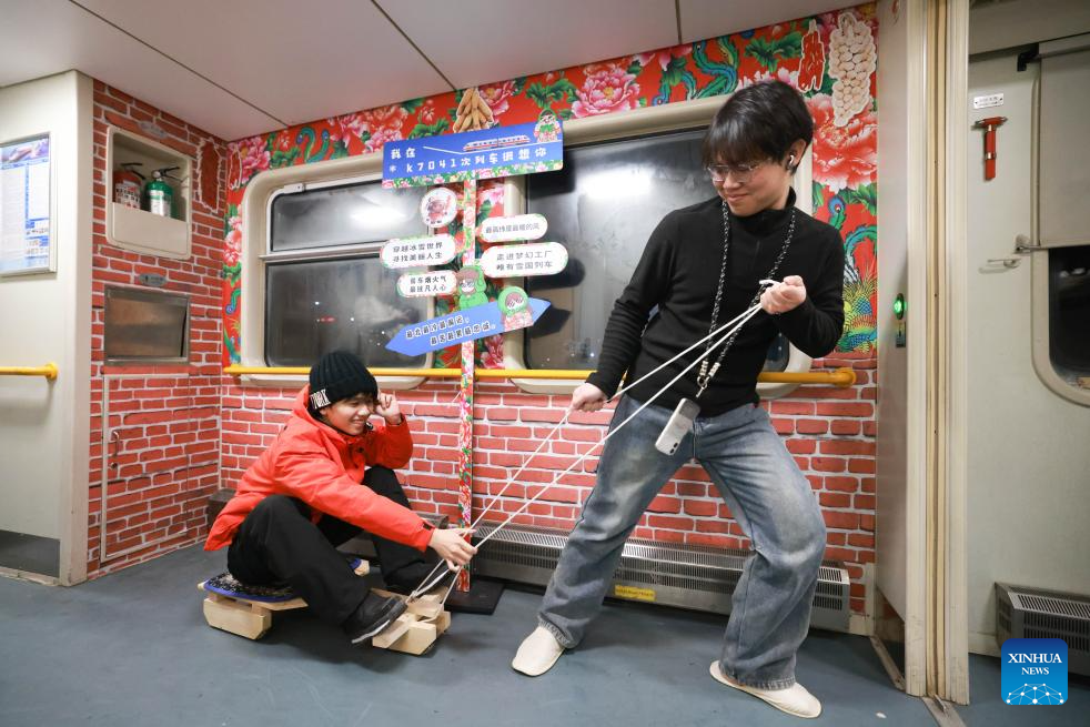 Foreign tourists experience a sledge on K7041, a train themed on folk culture of northeast China, in northeast China's Heilongjiang Province, Jan. 19, 2026. Recently, tourists from Southeast Asian countries have been flocking to Harbin, hailed as China's "Ice City," with unprecedented enthusiasm. (Photo by Xu Shuai/Xinhua)