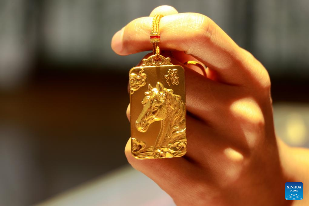 This photo taken on Jan. 16, 2026 shows a Year-of-the-Horse-themed gold product at a store in Binzhou City, east China's Shandong Province. (Photo by Chu Baorui/Xinhua)