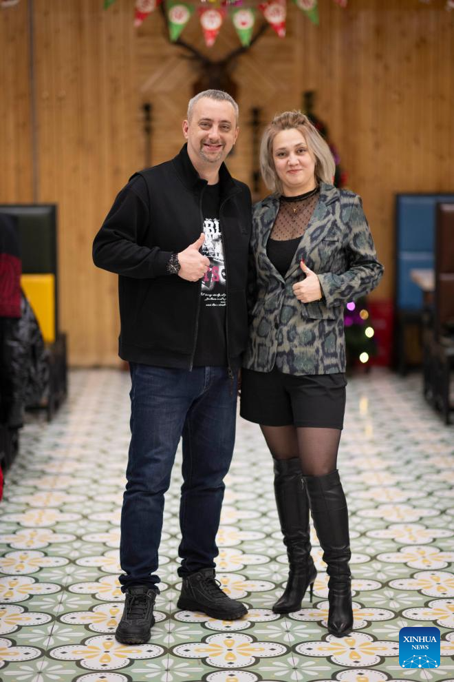 Artem Shishov (L) and his girlfriend Ira Klimena pose for a photo in Suifenhe, northeast China's Heilongjiang Province, Jan. 8, 2026. Artem Shishov from Russia's Vladivostok is a local internet celebrity. He moved to Suifenhe in China's Heilongjiang three years ago and is engaged in foreign trade and tourism-related work. (Xinhua/Zhang Tao)