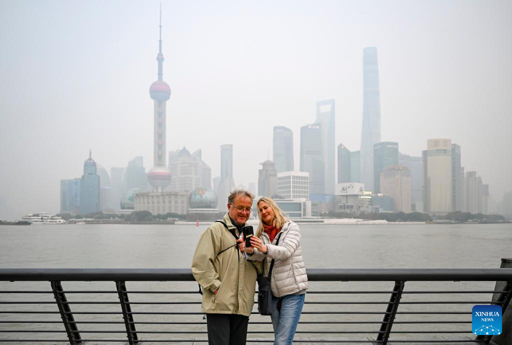 Austrian tourist Christian Edlinger (L) and his wife Heidi Reiss-Edlinger pose for a photo at the Bund in Shanghai, east China, Jan. 6, 2026. It was their fourth visit to China. (Xinhua/Chen Haoming)