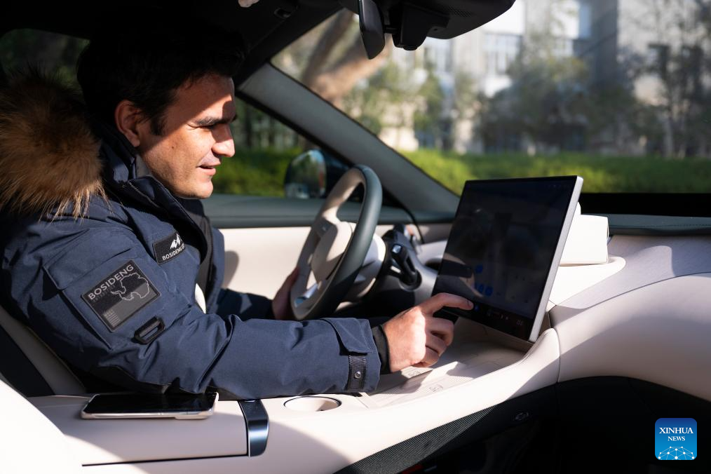 Mauri Joseph Tualaulelei tries a Chinese new energy vehicle (NEV) in Wuhan, central China's Hubei Province, Jan. 8, 2026. Tualaulelei from Samoa is pursuing a master's degree in Physical Education at Central China Normal University. He has been in China since 2017. (Xinhua/Wu Zhizun)