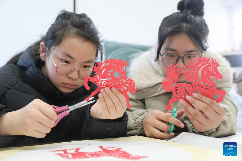 Students learn to make paper cuttings in Wenxian County of Jiaozuo, central China's Henan Province, on Feb. 8, 2026. Various extracurricular activities are available for students across China during the winter vacation. (Photo by Xu Hongxing/Xinhua)