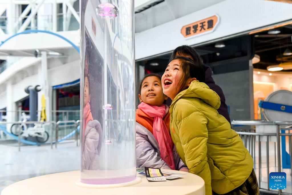 Children experience a scientific experimental device at a science and technology museum in Taizhou, east China's Jiangsu Province, on Feb. 6, 2026. Various extracurricular activities are available for students across China during the winter vacation. (Photo by Yang Yugang/Xinhua)