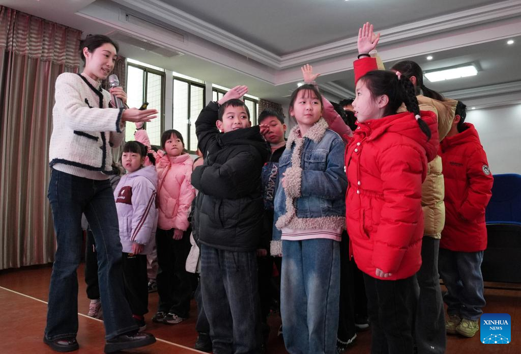 A power supply worker explains electricity usage knowledge to students at a primary school in Bo'ai County of Jiaozuo, central China's Henan Province, on Feb. 5, 2026. Various extracurricular activities are available for students across China during the winter vacation. (Photo by Cheng Quan/Xinhua)