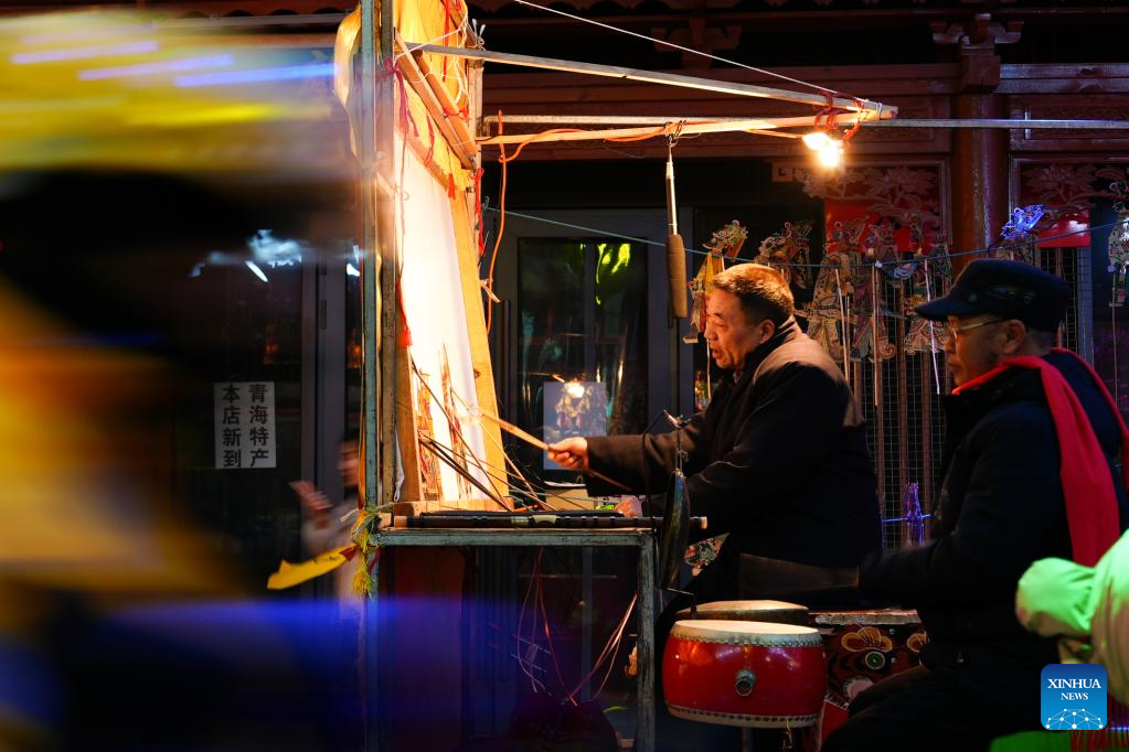 On a winter night in Xining, capital city of northwest China's Qinghai Province, a beam of light cuts through the cold, casting figures in red and green leather and flowing sleeves into sharp relief as gongs strike and a deliberate chant hangs over the street, holding time itself in suspended motion.