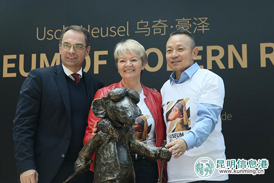Artist Ute Hauser presented her representative sculpture, Fashionable Mouse Ludwig, to Mr. Jin Feibao. File photo