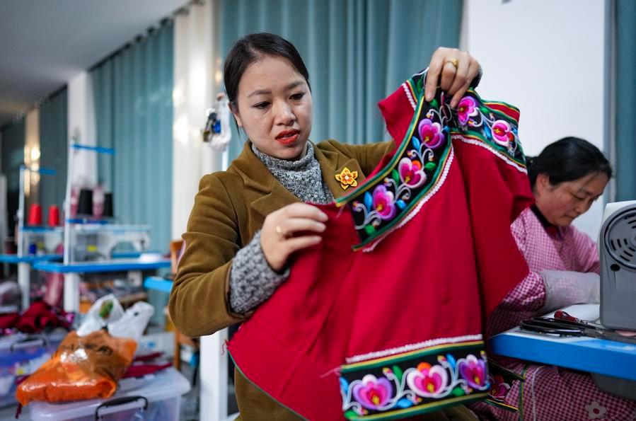 Jin Ruirui checks a piece of Yi ethnic costume featuring handmade embroidery at her studio in Mouding County, southwest China's Yunnan Province, Feb. 9, 2026. (Xinhua/Chen Xinbo)