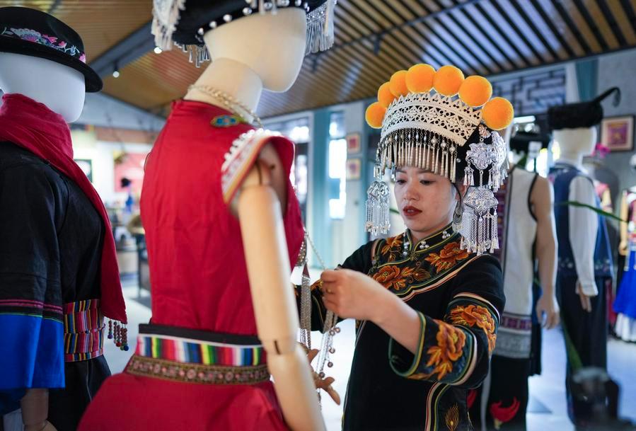 Jin Ruirui arranges her headwear at her studio in Mouding County, southwest China's Yunnan Province, Feb. 9, 2026. (Xinhua/Chen Xinbo)