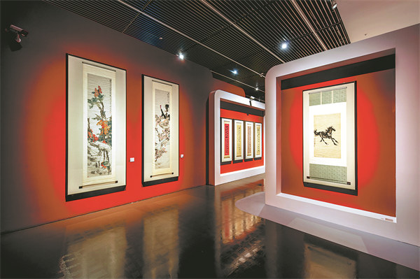 One highlight is an ink painting by contemporary artist Liu Danzhai. The large piece, spreading 3.67-meter wide and 1.41-meter tall, depicts eight horses staying by a willow-lined pond, drinking, bathing, and playing with the water, while some neigh and leap high, creating a joyous atmosphere.