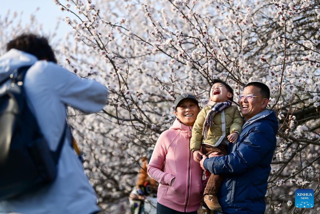Tourists pose for photos with blooming trees at the Daming Palace National Heritage Park, in Xi'an, northwest China's Shaanxi Province, March 9, 2026. Flowers bloom as temperature rises in China. (Xinhua/Zou Jingyi)