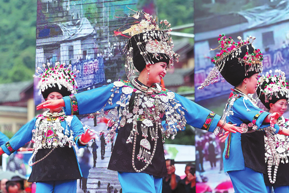 Miao women dressed in traditional ethnic attire and wearing full sets of silver ornaments dance during the Double Sixth Festival in Fenghuang county, Hunan province, on June 30. HUANG WENYUAN/FOR CHINA DAILY