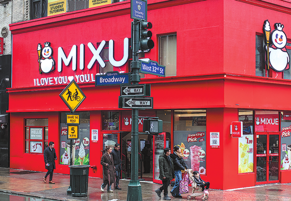 Pedestrians walk outside the store of Chinese tea beverage brand Mixue in New York on Feb 18. BRYAN ANSELM/GETTY IMAGES
