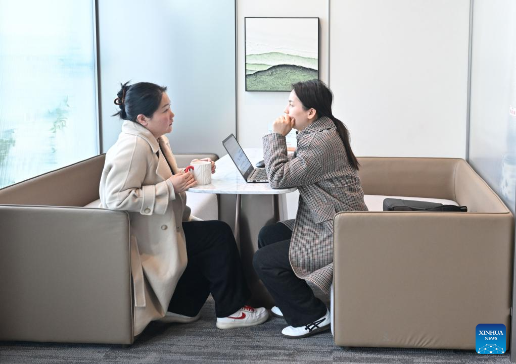 Gu Yanyan (L), founder of a startup company, talks with a fellow entrepreneur at a one-person-company (OPC) community in Nanjing, east China's Jiangsu Province, March 12, 2026. (Xinhua/Ji Chunpeng)