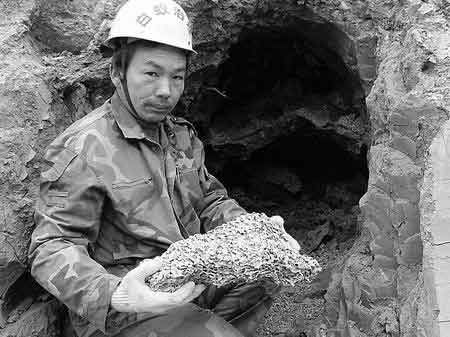 昨日上午9時(shí)許,記者來到三架山水庫,見10多位白蟻專家正在循著蟻道開挖壩體尋蟻巢。一個(gè)多小時(shí)后,他們在大壩壩體中間位置的外坡上,挖到一個(gè)直徑近一米的特大蟻巢。工程師付文亮小心翼翼地從巢穴深處的白蟻王室里取出一個(gè)拳頭般大的橢圓形“泥團(tuán)”,稍一用力掰開后,一個(gè)拇指般大且通體透明的白胖蟻后露了出來。