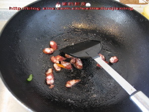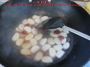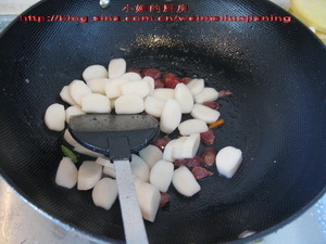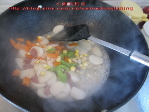 ????3 鍋燒熱,放油,放香腸進去炒一下,倒進年糕翻炒,在放進剛沒過年糕的溫水,大火燒開,蓋上蓋子燜兩分鐘,再倒進其余蔬菜炒至斷生,放糖,鹽,炒勻。出鍋前加少許生抽提鮮即可。(小媚的廚房)