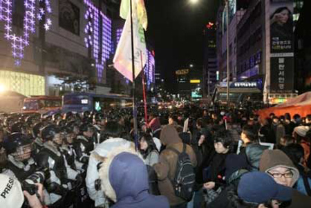 ????但大部分參加集會的市民利用地鐵等前往中區(qū)明洞和樂天百貨商場對面的明洞路口,于當晚9時30分重啟譴責大會,期間有幾次發(fā)生了警民沖突。