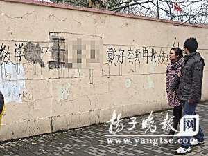 ????昨天中午11點(diǎn)鐘,記者來(lái)到中山北路350號(hào)某單位門前,只見(jiàn)黃色的圍墻上有一排醒目的黑色大字,上面書寫“請(qǐng)十二中數(shù)學(xué)老師王某某戴上套套再嫖妓做愛(ài),以免傳播性病”。此標(biāo)語(yǔ)讓人瞠目結(jié)舌,標(biāo)語(yǔ)的下方還有一句黑色大字已經(jīng)被人用石灰水涂抹掩飾,但隱約可見(jiàn)“禽獸不如”等字樣。據(jù)說(shuō)校方已經(jīng)報(bào)了警。目前警方已經(jīng)在調(diào)查。記者在現(xiàn)場(chǎng)時(shí),一位民警剛剛拍了一些照片取證。在現(xiàn)場(chǎng),醒目的標(biāo)語(yǔ)引來(lái)不少好奇的目光。有的瞥了一眼,搖了搖頭就離開了。幾位小學(xué)生路過(guò)這里,見(jiàn)大家都盯著墻壁看,他們看了一眼,相繼蹦蹦跳跳地走開了?!皩戇@個(gè)標(biāo)語(yǔ)的人沒(méi)有公德心,太狠毒了?!币晃煌A粲^看的市民說(shuō),350號(hào)旁邊就是一家桑拿場(chǎng)所,不遠(yuǎn)處就是十二中校址,在新學(xué)期的第一天,在這樣的地方攻擊人,太過(guò)分。也有市民表示,在墻壁亂涂寫這樣不雅觀的話語(yǔ),有損城市形象。