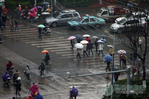 昆明迎來首場春雨,路上行人紛紛撐開傘、穿起雨衣。記者 何新聞/攝