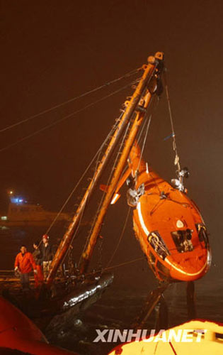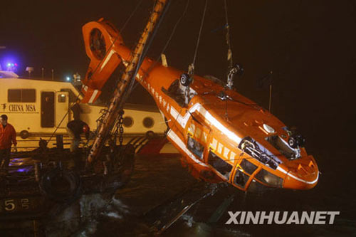 4月12日22時55分,“東海救111”輪成功將“雪龍?zhí)枴蹦蠘O科考船租用失事直升機機骸打撈出水。機骸由救助船送往附近碼頭。當日11時20分許,“雪龍?zhí)枴笨瓶即庥玫呐炤d直升機在完成科考任務從“雪龍?zhí)枴狈祷伛v地時,起飛約一分鐘后失事墜入江中。中國海上搜救中心迅速組織力量,全力投入救助,落水的四名機組人員中三人獲救,一人失蹤。
