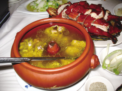 醇香鮮美。汽鍋雞是云南獨(dú)有的高級(jí)風(fēng)味菜,它的烹制方法特殊,雞肉細(xì)嫩、湯汁鮮美、原汁原味、富于營(yíng)養(yǎng),在國(guó)內(nèi)外均享盛譽(yù)。早在清代乾隆年間,汽鍋雞就在滇南地區(qū)民間流傳,跑今已有200來年。滇南地區(qū)建水縣所產(chǎn)陶器歷史悠久,式樣古樸、特殊。當(dāng)?shù)厝藯顬r利用建水陶,獨(dú)出心裁地研制出特殊的中心有嘴的蒸鍋,名曰:“汽鍋”。烹飪時(shí)在汽鍋下放一盛滿水的湯鍋,然后把雞塊放入汽鍋內(nèi),純由蒸汽將雞蒸熟。此菜湯汁為蒸汽凝成,保持了原汗原味,肉嫩香,湯清鮮,深得食者贊譽(yù)。此后汽鍋雞名傳中外,膾炙人口。后來人們又在汽鍋雞中配加云南特產(chǎn)的名貴藥材“三七”、“蟲草”、“天麻”等,使雞湯更加味美鮮甜,既增加了營(yíng)養(yǎng)和醫(yī)療作用,又別具風(fēng)味,發(fā)揮了汽鍋雞營(yíng)養(yǎng)豐富,滋補(bǔ)強(qiáng)身的優(yōu)點(diǎn)。